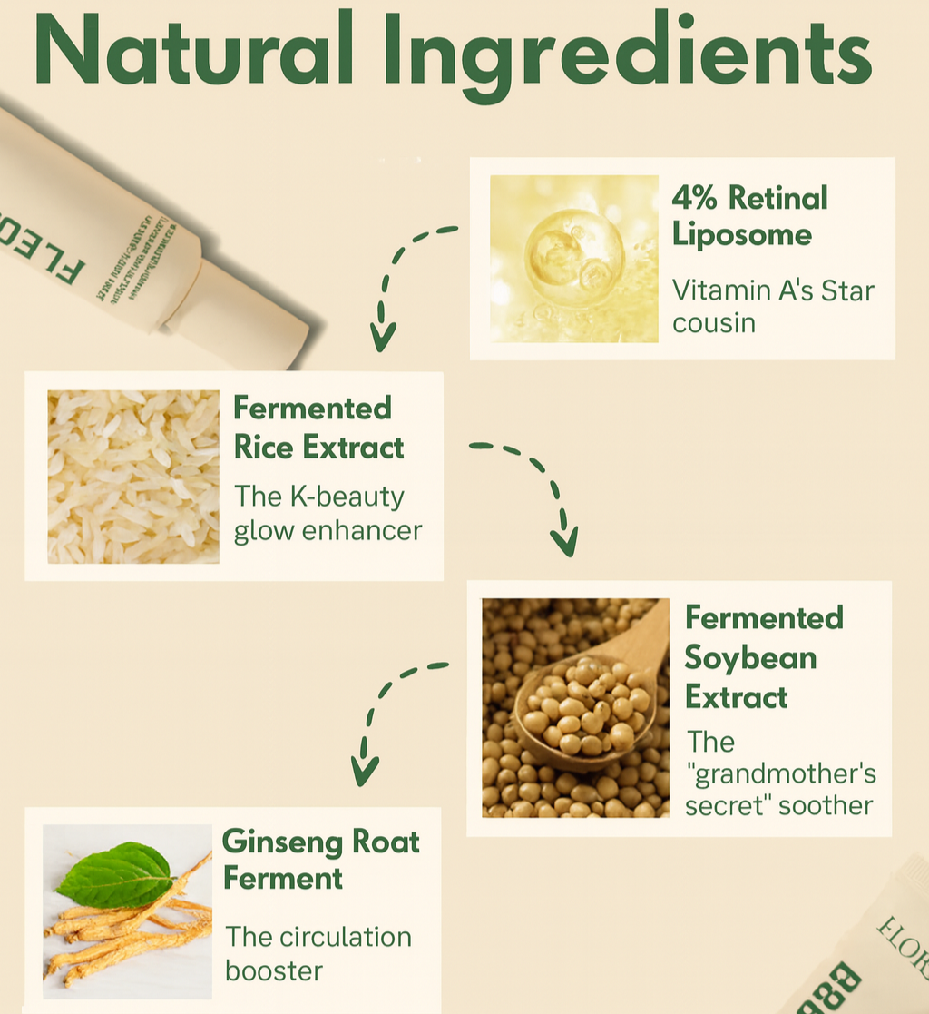 Niacinamide, Retinal, Lactobacillus/Panax Ginseng Root Ferment Filtrate, Lactobacillus/Rice Ferment, Lactobacillus/Soybean Ferment Extract, Root Extract, Cnidium Officinale Root Extract, Dioscorea Japonica Root Extract, Paeonia Suffruticosa Root Extract, Rehmannia Chinensis Root Extract,